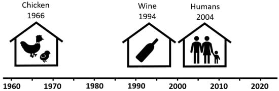Timeline of scientific reporting of sensory problems caused by indoor CA(s). The timeline is based on references from the poultry, wine, and housing sectors [14,28,29,37]. The timeline will differ slightly if based on other information sources. For example, the German 2004 scientific report on CAs causing musty odors in houses [37] was preceded by a non-scientific document in Swedish from 1999 on CAs causing moldy odors [43].
