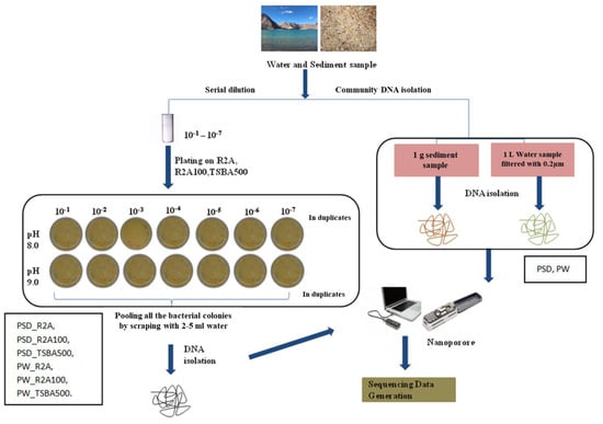 About 1 g of sediment sample (PSD) was diluted in 10 mL of autoclaved distilled water and subjected to serial dilution by a factor of 10−1 to 10−7. Water samples (PW) were filtered through a 0.22 µm filter (Merck Millipore Ltd., Darmstadt, Germany) and the filter was suspended in 10 mL autoclaved distilled water in 50 mL falcon tubes (Tarsons, Kolkata, India), vortexed briefly, and serial dilutions were prepared (10−1 to 10−7). About 0.1 mL of the sediment and water dilutions was plated in duplicates on three types of media formulation prepared at two different pH levels (8.0 and 9.0), i.e., Reasoner’s 2A broth (R2A; Hi-Media), R2A broth, and tryptone soya broth (TSB, Hi-Media) diluted 100 times (R2A100) and 500 times (TSBA500) (Table S5), respectively, with distilled water, solidified with 1.5% (w/v) extra-pure agar (Hi-Media). The plates were incubated at 25 °C for up to 8 weeks considering slow growing bacteria, and the colony forming units (CFUs) were recorded. After incubation, colonies were flooded with sterile distilled water (2–5 mL) and bacterial suspensions were pooled together from all the dilutions (10−1 to 10−7) and pH (8.0–9.0), for all the media (Figure 1).