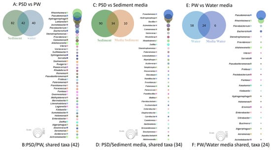 Venn diagram representing details of total number of shared and unique taxa (at genus level) among sediment (PSD) and water (PW) samples (A); PSD and PSD media samples (C); and PW and PW media sample (E). Bubble plot depicts the identity of shared taxa among sediment (PSD) and water (PW) samples (B); PSD and PSD media samples (D); and PW and PW media sample (F).