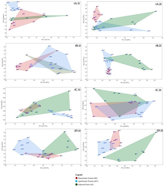 Principal component analysis (PCA) was performed using DGGE patterns of bacterial (A.1,A.2), phosphate-solubilizing bacterial (B.1,B.2), diazotrophic (C.1,C.2), and fungi (D.1,D.2) genes between cultivation systems (MS, AFS, and AF) at t1 (1) and t2 (2). The values of the first and second axes indicate the variance (%) explained by each dimension.