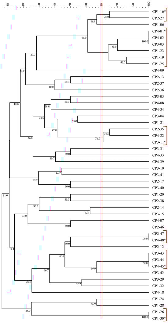 Dendrogram based on the band profile generated by BOX-PCR using the UPGMA method from isolated strains. The 70% similarity value is indicated by the red line and is used to consider a group of strains. Groups with more than one strain are highlighted in red, and the strain representing each group is indicated with an asterisk (*).