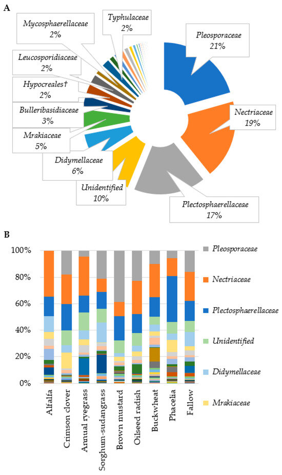Fungal family relative abundance profiles in residue samples. (A) Pie chart summarizing the average relative abundance of these families across 54, n = 54; (B) differences in relative abundance of fungal families by cover crop, n = 6. † represents enigmatic taxa within the highlighted order.