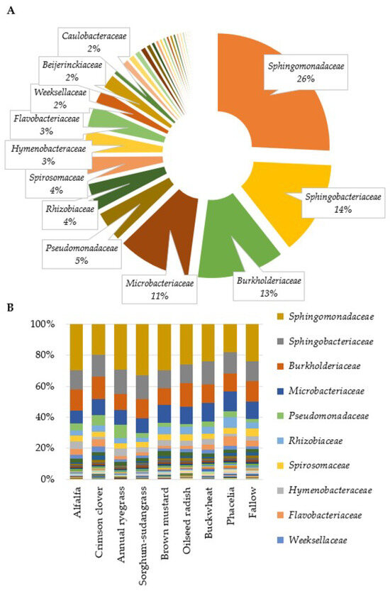 The sequencing of the 16S rRNA gene for bacterial communities yielded 189,923 reads, narrowed down to 174,085 non-chimeric, filtered reads. These were then categorized into 17,170 OTUs. Post-abundance and taxonomy filtering, 1067 OTUs remained, with 765 identified from a reference database and 302 annotated de novo (Table S2). The most prevalent bacterial family in the residue was Sphingomonadaceae, succeeded by Sphingobacteriaceae and Burkholderiaceae (Figure 2A). Additionally, the composition of bacterial families varied with the type of cover crop used (Figure 2B).