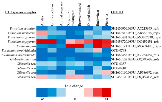 Differentially abundant Fusarium OTUs in cover crop residue. The heatmap shows the fold change in the relative abundance of Fusarium OTUs from each cover crop residue compared to fallow residue. Species names are listed on the left and OTU IDs are listed on the right.