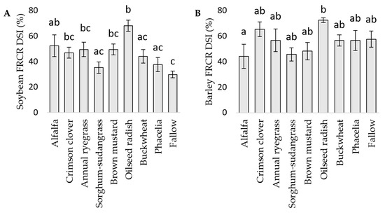 Effects of previously planted cover crops on soybean (A) and barley (B). Fusarium root and crown rot (FRCR) disease severity index (%) with data from 2019 and 2020; n = 6. Different letters represent statistically significant differences at p-value < 0.05.
