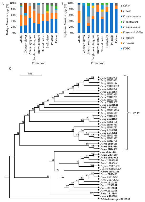 Fusarium isolates from barley and soybean roots collected from the second trial. Proportions of Fusarium spp. isolates by the total number of Fusarium isolates per cover crop, for barley (A) and soybean (B), presented in stacked bar graphs (n = 6). A rooted phylogenetic tree cladogram with sequences from the eight main Fusarium spp. isolates and a Trichoderma spp. Tef-1α sequence set as the outgroup (C); n = 45. The labels list a short form of the species name along with the unique isolate ID, with barley isolates in bold. F.oxy is short for F. oxysporum, F.com = F. commune, F.sol = F. solani, F.equi = F. equiseti, F.sporo = F. sporotrichioides, F.gram = F. graminearum, F.cere = F. cerealis, and F.ave = F. avenaceum. FOSC = F. oxysporum species complex.