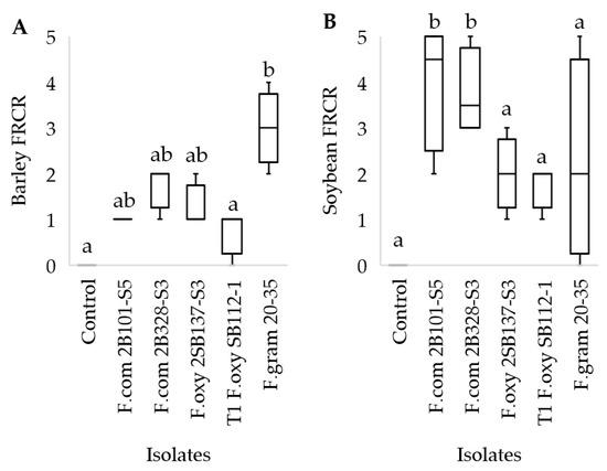 Box plots representing the effect of various field isolates used as Fusarium inoculum on FRCR in barley (A) and soybean (B), based on the 0 to 5 disease-rating scale. The whiskers represent the upper and lower 25% quartiles and the box represents 50%. F.oxy is short for F. oxysporum, F.com = F. commune, and F.gram = F. graminearum, all compared to non-inoculated control. Connecting letters represent significant differences p < 0.05.