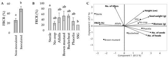 The effect of F. graminearum inoculation on FRCR DSI in barley in the greenhouse trial (A). The effect of different cover crop soils on FRCR DSI in barley under high disease pressure (B). Connecting letters represent significant differences p < 0.05. Principal component analysis comparing disease severity and agronomic data collected from barley greenhouse trials, with F. graminearum inoculum (C). FRCR = Fusarium root and crown rot; SSG = sorghum-sudangrass.