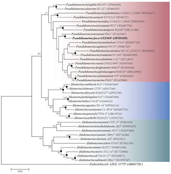 Neighbor-joining phylogenetic tree based on 16S rRNA gene sequences (1505 bp) showing the phylogenetic position of strain GXY010T and other closely related species. Percentage bootstrap values above 50% (1000 replicates) are shown at branch nodes. Closed circles indicate that the corresponding nodes were also recovered in trees generated with the neighbor-joining, maximum-likelihood and maximum-parsimony algorithms. Red, Pseudidiomarina genus. Blue, Idiomarina genus. Green, Aliidiomarina genus. Escherichia coli ATCC 11775T (GenBank accession: AB681728) was used as the outgroup. The putative novel genospecies are highlighted in bold. Bar, 0.02 nucleotide substitutions per nucleotide position.