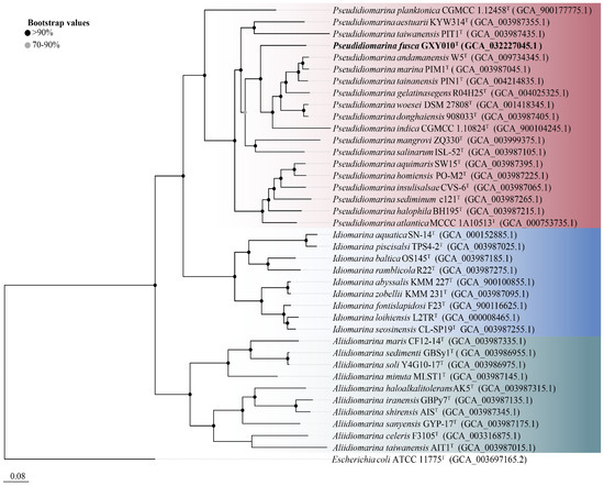The genome of strain GXY010T is composed of 2,766,857 bp, housing 2664 ORFs, which encompass 2586 CDSs and 78 RNAs (71 tRNAs, 3 rRNAs and 4 ncRNAs). Detailed draft genomic characteristics of strain GXY010T and reference strains can be found in Table S1. The core genome-based phylogenetic tree aligns with the relationships observed in the 16S rRNA gene-based tree, placing GXY010T within the genus Pseudidiomarina (Figure 2). WGS results indicate that the genomic DNA of strain GXY010T has a G+C content of 48.0% and is classified within the genus Pseudidiomarina (47.2–53.0%). The ANI values between strain GXY010T and reference species P. tainanensis MCCC 1A02633T and P. taiwanensis MCCC 1A00163T were 73.4% and 70.6%, respectively, which were designated below the threshold of 95–96% [34]. Similarly, the digital DDH values between strain GXY010T and reference species P. tainanensis MCCC 1A02633T and P. taiwanensis MCCC 1A00163T were 19.2% and 14.5%, respectively, which were well below the recognized threshold of 70% for establishing a novel species [35].