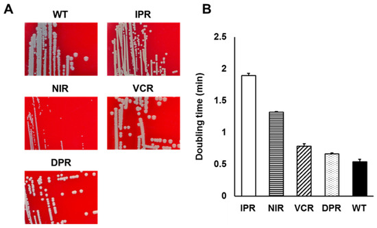 (A) Colony phenotype of each strain. Cells were grown on the sheep blood agar plates and incubated at 37 °C for 24 h. (B) The doubling time of each antimicrobial-agent-resistant mutants. Cells such as the IPR, NIR, VCR, DPR strains, and WT were grown in MHB medium, and the doubling times were calculated based on the optical density at 600 nm during the exponential growth phase.