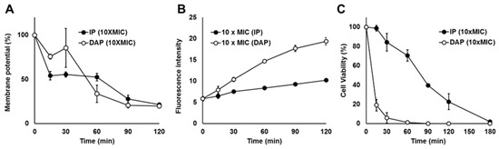 Generally, AMPs, including daptomycin, damage bacterial cytoplasmic membranes. Therefore, we investigated the mechanism of action of IP on the S. aureus strain ATCC 29213 using a fluorescent probe (Figure 3A,B). IP rapidly decreased the cytoplasmic membrane potential by approximately 50% after 15 min, and daptomycin decreased the cytoplasmic membrane potential by <50% after 60 min (Figure 3A). The membrane potential decreased to approximately 20% after 120 min for both IP and daptomycin (Figure 3A). The fluorescence intensity at 617 nm, an indicator of membrane permeability, increased over time for both IP and daptomycin (Figure 3B). However, cells treated with IP showed a smaller loss in membrane permeability than cells treated with daptomycin (Figure 3B). Correspondingly, IP decreased the cell viability by 28% after 60 min and daptomycin decreased cell viability by 80% after 15 min (Figure 3C).