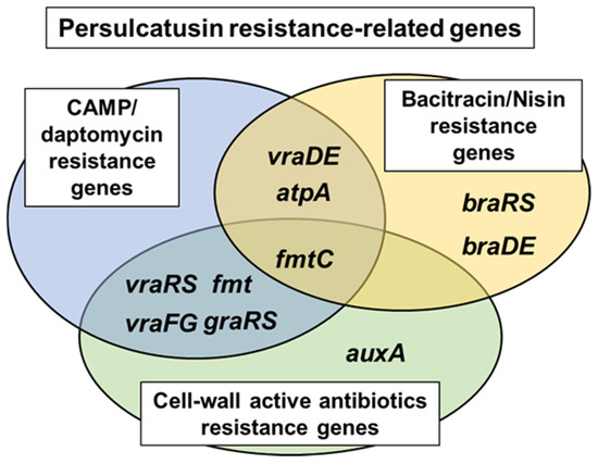 We screened a gene-deficient mutant library to identify factors associated with IP resistance (increased MIC of IP) and identified 16 mutants with hypersusceptibility to IP (Table 2). These were classified into three groups based on previous reports (Figure 4). Although the 16 genes identified in this study have been previously reported, they are presumed to play a role in IP resistance (the increased MIC of IP) through a mechanism that differs from other AMPs. FmtC (MprF), the GraSR TCS, and VraFG have been identified as resistance factors in other AMPs, such as LL-37 and human defensins [11,12,33]. FmtC (MprF), which modulates bacterial cytoplasmic membrane charges due to the formation of lysylphosphatidylglycerol (LPG), confers resistance on bacterial cells against β-lactams and CAMPs [44,45,46]. The GraSR TCS controls CAMP resistance in S. aureus through D-alanylation of bacterial cell-wall teichoic acid, which is mediated by the dltABCD operon, and the LPG formation by FmtC [47,48]. This TCS also controls the expression of the vraFG operon, located directly downstream of GraSR genes, which encodes an ABC transporter contributing to CAMP resistance [33]. These genes were also selected as factors associated with IP resistance (the increased MIC of IP), indicating that the mechanism of action and/or resistance to IP (the increased MIC of IP) is likely shared, at least in part, with these AMPs. It is noteworthy that FmtC (MprF) and VraFG are found to be present in the core genome of S. aureus [49], suggesting that IP has a potential to be a novel anti-S. aureus therapeutic agent.