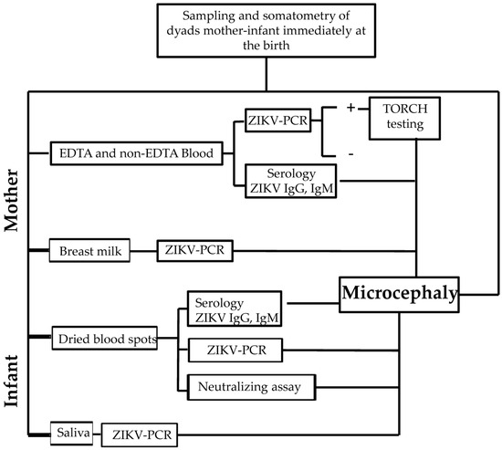 This was an observational, cross-sectional study of all mother–infant dyads attended by the obstetric department of the Hospital General de Pochutla, Oaxaca, within the first 12 postnatal hours during the study period (December 2017 to February 2018). This study period was considered optimal because it included dyads who had been in their first or second pregnancy trimester during the rainy season, when the risk of exposure to this vector-borne disease is most common [12,13]. Clinical data were collected and infant head circumference was assessed based on INTERGROWTH-21st values [14]. The experimental methodology is summarized in Figure 1.