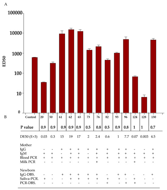 Analysis of the neutralization of blood samples of infants with serology and active infection at birth. (A) ED50 was obtained from 13 samples from infants that were positive (determined by PCR) which included 6 IgG-positive samples from the blood of the infants. (B) Samples from mothers and infants with active infection, comparing the DE50 with serology and PCR in the samples from the mothers and infants.