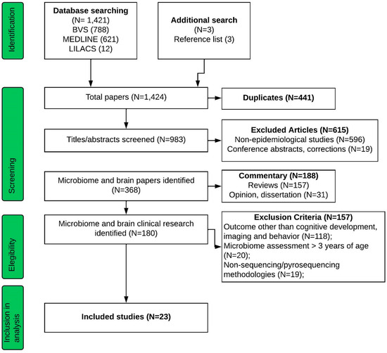 We conducted a systematic review according to the parameters established by Page et al. (2020) [18]. The studies included were retrieved from searches made in the scientific bases LILACS, MEDLINE, MEDCARIB, PAHO-IRIS, and WHOLIS, or based on the close examination of relevant articles found in the reference lists of the studies included in the present systematic review. The scientific database was consulted up to November 2023. No restrictions were applied regarding the date of publication of the study. The following matches of keywords were used: (gastrointestinal microbio* or gut microbio*) and (neurodevelopment or neurobehavior). As a first stage of the analysis, the articles retrieved from the initial search were selected by their titles and abstracts. They were then screened according to the inclusion and exclusion criteria (Figure 1—modified from PRISMA flow diagram). Exclusion criteria included non-epidemiological or non-RCT (randomized controlled trials) studies; outcome other than cognitive development, imaging, and behavior; microbiome assessment > 3 years of age; non-sequencing/pyrosequencing methodologies. Inclusion criteria included microbiome evaluation; validated scales for brain outcomes evaluation; microbiome evaluation up to 3 years of life, including healthy and unhealthy infants. All studies included in this systematic review determined gut bacterial composition using next-generation sequencing technologies. In addition, exposure was considered the microbiome evaluation during the first three years of life, and the outcome was defined as cognitive development, imaging, and behavior assessment. From a total of 1424 papers, 23 were selected for final inclusion in our systematic review. The selected articles were independently revised (as full manuscripts) by two of the authors, N.F.N. and P.A.S. The PRISMA checklist is provided in the Supplementary Material and the protocol was registered in Prospero (CRD42023458504).