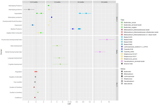 A summary of the main associations, represented by beta coefficients and 95% confidence interval, is shown in Figure 2. This figure illustrates that among the key taxa affecting the brain, Bacteroides abundance during the first year of life was associated with better neurodevelopmental outcomes at 2 years of age (cognitive, language and motor scores). Similarly, Bifidobacterium was positively associated with emergence/extroversion (positive affectivity), higher practical reasoning, adaptive skills, and normal development scores. Varying results between Lachnospiracea, Streptococcus, and Faecalibacterium and behavior and brain development were reported.