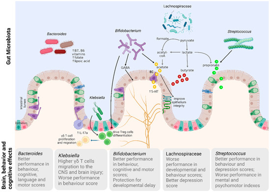 The role of gut microbiota composition on brain development during the first one thousand days of life. The gut microbiota can impact the host enteric and central nervous system through various mechanisms that collectively may affect the brain, behavior, and cognition. These mechanisms include the biosynthesis of vitamins, folate, and lipoic acid related to the abundance of Bacteroides. Bifidobacterium plays a role by producing acetate and neuroactive substances, such as GABA and 5-HT. Also, Bifidobacterium can induce immune cells maturation and improve the epithelium integrity (effect described in the BBB as well). Bifidobacterium, Lachnospiraceae, and Streptococcus integrate a trophic chain to produce the main SCFAs, acetate, butyrate, and propionate. Klebsiella is a potential pathogen genus, its abundance is linked to a pro-inflammatory T cell response and brain injury. SCFA: short chain fatty acid; BBB: blood–brain barrier; 5-HT: 5-hydroxytryptamine; GABA: gamma aminobutyric acid. Upward arrows indicate increase of B7, B6, folate, lipoic acid, IL-17a and 5-HT. Figure created with BioRender.com.