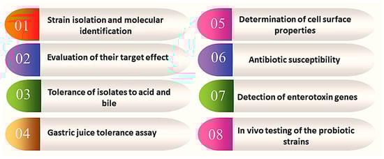 The in vivo testing of the probiotic strains is essential to evaluate their safety and efficacy in reducing the colonization and/or replication of pathogenic bacteria in the gut [25]. This can be carried out by administering the investigated strains to animal models of pathogenic infection and measuring the number of pathogenic bacteria in the gut and their effect on inflammation [33]. In addition, advanced analytical methods such as transcriptomics, proteomics, and metabolomics are used to measure metabolic changes and protein expression in response to probiotic treatment for the identification of new biomarkers of probiotic efficacy and provide a better understanding of the mechanisms of action of probiotics [34]. Recently, the development of high-throughput sequencing, including microbiome analysis methods, allows the analysis of the microbial community in the gut before and after probiotic treatment for evaluating the effects of probiotics on the gut microbiome and identifying new probiotic strains [35].