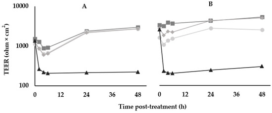 Effects of BV379 lysates on Caco-2 cell monolayer transepithelial electrical resistance (TEER) in duplicate experiments (n = 2, panels (A,B)). TEER was measured at before treatment (0 h) and at 2, 4, 6, 24, and 48 h after treatment. ■, Untreated Caco-2 cells; ◆, “blank”/uninoculated lysate processing control; ●, BV379 lysate treatment; ▲, LPS treatment (positive control). Values on the y-axis are plotted on a logarithmic scale.