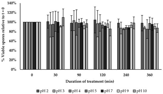 BV379 spore powder was diluted in Butterfields’s buffer to 1 × 1011 CFU/mL. The spore suspension was evenly split into seven different bottles that were adjusted to a pH of 2, 3, 4, 5, 7, 9, or 10 using hydrogen chloride or sodium hydroxide. Samples (1 mL each) were withdrawn at baseline and at 30, 90, 120, 180, 240, 300, and 360 min thereafter, serially diluted in Butterfield’s buffer, and plated on TSA. The plates were incubated overnight at 35 °C. The resulting colonies were enumerated and used to calculate the CFU/mL at each timepoint. The percent survival at each time point was calculated by comparing the CFU/mL to the baseline. The data presented are the average of two trials conducted using two different batches of BV379 spore powder (Section 2.1).