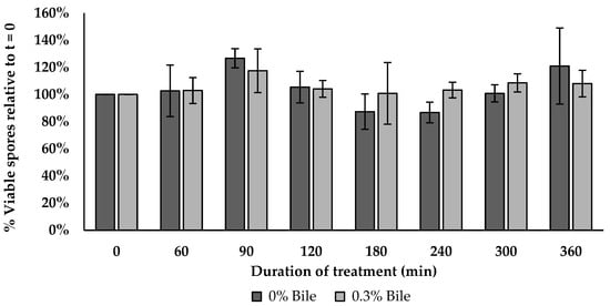 BV379 spore powder was diluted in Butterfields’s buffer to 1 × 1011 CFU/mL. The spore suspension was evenly split into two different bottles. Bile salt (Sigma-Aldrich, St. Louis, MI, USA) was added to one bottle to a concentration of 0.3% (wt/vol), comparable to bile salt levels in the human small intestine [101]. The bottles were incubated at 35 °C, and samples (1 mL each) were withdrawn at baseline and at 60, 90, 120, 180, 240, 300, and 360 min thereafter, serially diluted in Butterfield’s buffer, and plated on TSA. The plates were incubated overnight at 35 °C. The resulting colonies were enumerated and used to calculate the CFU/mL at each timepoint. The percent survival at each time point was calculated by comparing the CFU/mL to the baseline. The data presented are the average of two trials conducted using two different batches of BV379 spore powder (Section 2.1).