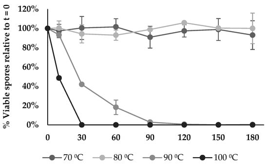 BV379 spore powder was diluted in Butterfields’s buffer to 1 × 108 CFU/mL. The spore suspension was aliquoted into 52 micro centrifuge tubes to test the spore stability at four different temperatures (i.e., 70 °C, 80 °C, 90 °C, and 100 °C) for 13 different incubation periods (i.e., 0, 5, 10, 15, 20, 25, 30, 45, 60, 90, 120, 150, and 180 min). After each respective heat treatment, each sample was cooled, and 100 µL was plated on TSA. The plates were incubated overnight at 35 °C. The resulting colonies were enumerated and used to calculate the CFU/mL at each timepoint. The percent survival at each time point was calculated by comparing the CFU/mL to baseline. The data presented are the average of two trials conducted using two different batches of BV379 spore powder (Section 2.1).