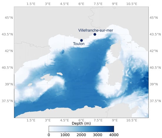 Sampling area of plastics and their associated plastisphere in the northwestern Mediterranean Sea, in the Toulon and Villefranche Bays, France. This map was created with MATLAB software version R2021b by using the M_Map package. Credits: Lucas Almeida.