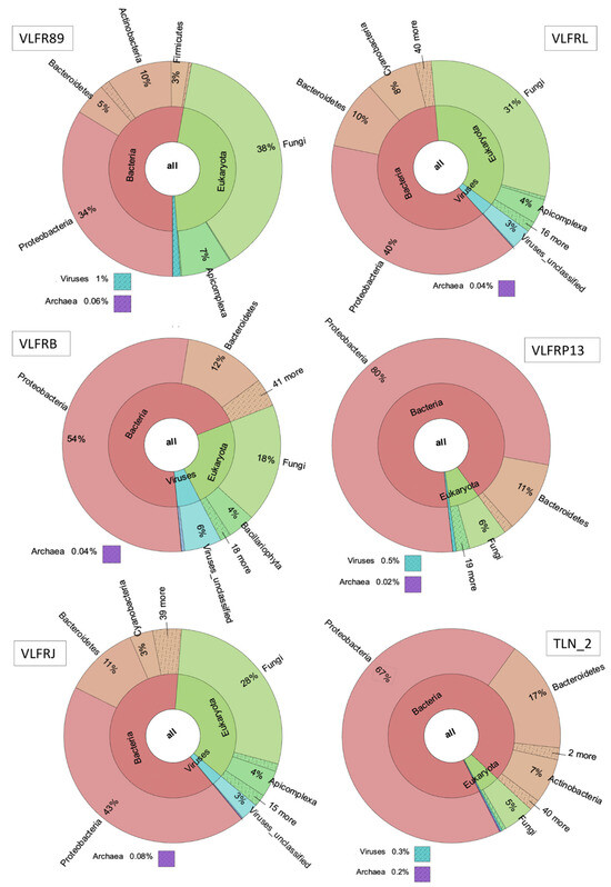 Bacteria was the most abundant kingdom observed (53 to 98% of total reads per sample), followed by eukaryotes (1% to 46% of reads per sample). Viruses’ abundance was lower compared to other kingdoms, ranging from 0.1% to 6% (Figure 2; Supplementary Material, Figure S1). Even though archaea was also present, it showed lower abundances than viruses, with a maximum of 0.2% in one sample, and ranging from 0.04% to 0.1% in the others.