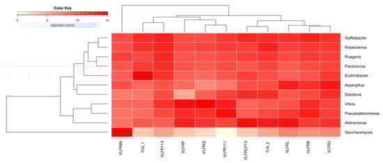 At the phylum level, Proteobacteria was the most abundant group, accounting for over 30% of reads in all samples but three, and 89% in one sample (Supplementary Material, Figure S2). Other bacterial phyla, such as Bacteroidetes, Cyanobacteria, Actinobacteria, and Planctomycetes, were among the most abundant phyla in all samples, along with Ascomytoca (fungi) and Apicomplexa (protozoan) (Figure 2; Supplementary Material, Figure S2). At the genus level, we observed a dominance of bacteria Sulfitobacter, Roseovarius, Vibrio, and Ruegeria, with variable proportions among samples (Figure 3). Other bacterial genera, such as Erythrobacter, Dokdonia, Pseudoalteromonas, and Paracoccus, as well as the fungi Aspergillus, were among the ten most abundant ones. The hierarchical clustering of abundance levels based on genus counts showed that one sample from Villefranche (VLFR89) was the most distant from the others (Figure 4). An explanation for this discrepancy is given hereafter, in the discussion section. It is important to highlight that the fungi Saccharomyces was highly abundant in this specific sample, and it was virtually absent or present in low abundances in the other samples. Vibrio species were particularly present in three Villefranche samples (VLFRP, VLFRQ, VLFR111), which were hierarchically clustered (Figure 3).