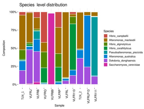 Three Vibrio species (V. campbelli, V. alginolyticus, and V. coralliilyticus), which are emerging pathogens for aquatic organisms [41,42], were among the eight most abundant species in the whole dataset. In addition, Staphylococcus species, such as S. aureus, which is one of the most important pathogens found in seafood [43], were also present, with S. aureus representing 3% of Bacilli bacteria in sample VLFR89.