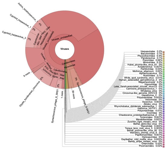 Other groups of marine organisms, such as mammals, can be affected by viruses. Poxvirus has been associated with skin lesions in bottlenose dolphins (Tursiops truncatus), killer whales, long-beaked common dolphins (Delphinus capensis), and Burmeister’s porpoises (Phocoena spinipinnis) [82]. Cutaneous Poxvirus infections in cetaceans can develop on any part of the body and cause the so-called “tattoo skin disease–(TSD)” [83]. In addition, the Phycodnaviridae family (which represented 5% of all viruses in one sample), comprises members known to infect marine and freshwater algae [84]. They can have various pathological effects depending on the viral species and the host, and play important roles in the algal community structure and dynamics of algal blooms [85].