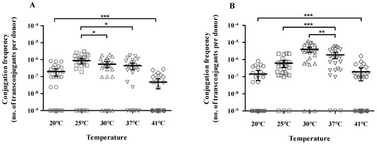Conjugation efficiency according to temperature. (A) blaKPC- and (B) blaNDM-carrying K. pneumoniae. Each data point represents an individual. Each bar indicates the average value for a group, and error bars represent the 95% confidence interval for the ratio. The significance of differences between the temperature groups is shown as * p < 0.05, ** p < 0.01, and *** p < 0.001.