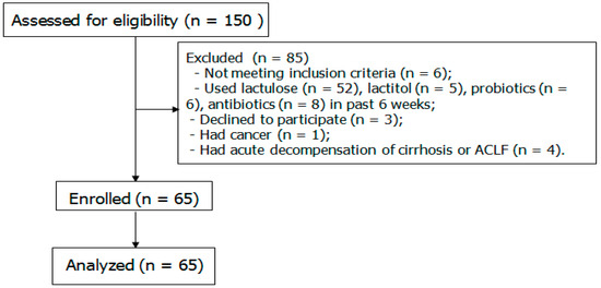 We included patients aged 18 years and older with stable cirrhosis who presented to our clinic for periodic medical examinations. The patients who had used lactulose or lactitol; or other prebiotics, probiotics, antibiotics, or prokinetics were excluded. Those who had consumed alcohol in the past 6 weeks, had a current infection, inflammatory bowel disease, cancer, or any other disease were also excluded. We also excluded patients with signs of acute decompensation of cirrhosis (the development of grade 2–3 ascites and/or overt hepatic encephalopathy within 2 weeks before inclusion) and acute-on-chronic liver failure (ACLF), since they may have had acute intestinal injuries not related to the effect of the gut microbiota [16,17].