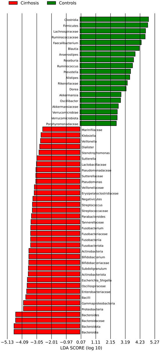 The gut microbiota of patients with cirrhosis were significantly different from the gut microbiota of healthy controls. In particular, the abundance of Bacilli, Bacteroidia, Enterobacteriaceae, Erysipelatoclostridiaceae, Lactobacillaceae, Streptococcaceae, Veillonellaceae, Actinobacteriota, Bacteroidota, Proteobacteria, and several other taxa was increased; and the abundance of Clostridia, Lachnospiraceae, Ruminococcaceae, Blautia, Faecalibacterium and Firmicutes was reduced in patients with cirrhosis (Figure 2).