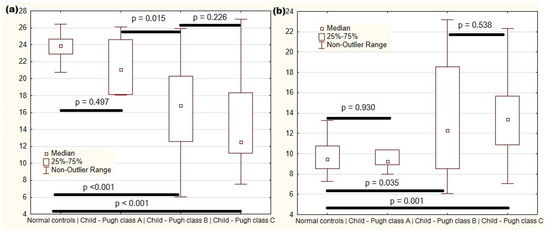 The severity of cirrhosis was assessed according to the Child–Pugh score, whereby class A corresponds to compensated cirrhosis, class B to moderately decompensated cirrhosis, and class C to severely decompensated cirrhosis [20].