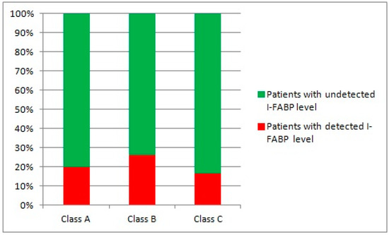 The frequency of detection of I-FABP in the blood did not depend on the Child–Pugh class of cirrhosis (p > 0.050; Figure 5).