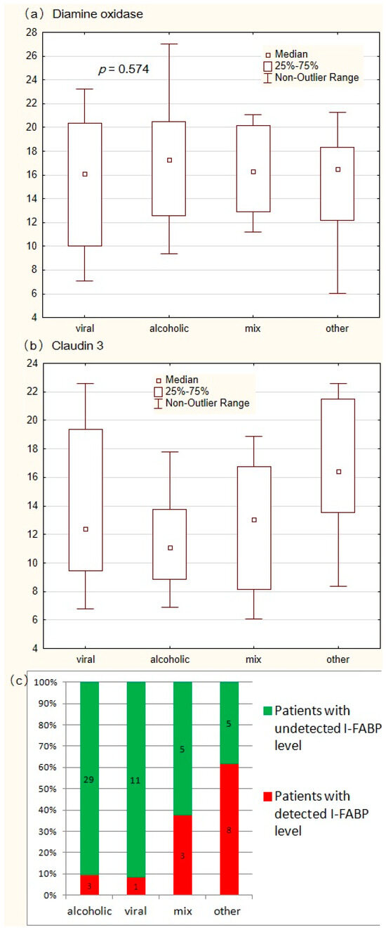 Comparison of the levels of tested biomarkers of the intestinal epithelium (diamine oxidase (a), claudin 3 (b), and I-FABP (c)) between patients with alcoholic, viral, mixed alcoholic and viral cirrhosis, and cirrhosis of other origins.