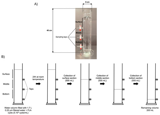 The cysts of A. castellanii, V. vermiformis, or B. mandrillaris, aged 0 to 23 weeks, were added to the water column containing 1.7 L of distilled water pre-filtered through a 0.22 µm porosity filter (Sartorius Stedim Biotech, Aubagne, France), in order to mimic, in a laboratory-scale model, the conditions of water storage in a DWST, with a maximal volume of 3 mL to reach a final cellular density of 5 × 104 cysts/mL. The water column was further covered with parafilm and a cap of aluminum foil (Figure 1B).