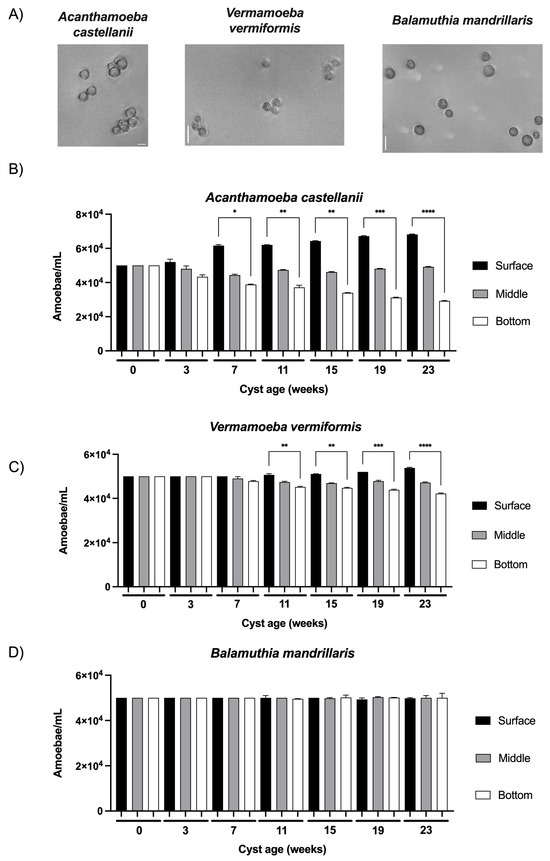 Just after their formation at the age of 0 weeks, the cysts, which were selected based on their resistance to SDS treatment [12], developed a cell wall with characteristic layers typical of mature cysts of the three FLA species studied in the current work (Figure 2A). At this initial time point, the cysts of A. castellanii, V. vermiformis, and B. mandrillaris were equally distributed in the three sections, namely surface, middle, and bottom, with an amoebal density of 5 × 104 amoeba/mL after a 24 h incubation in the water column (Figure 2B–D). Although no significant difference was observed in cyst morphology or volume within each species of the three FLA studied for the whole duration of the study, cyst size varied substantially between FLA species: A. castellanii from 14 to 23 µm, V. vermiformis from 9 to 13 µm and B. mandrillaris from 11 to 17 µm (Figure 2A). Additionally, several variations in vertical distribution were noticed according to cyst age: at the age of three weeks, the cysts of A. castellanii showed a tendency to be more abundant at the surface compared to the bottom (Figure 2B). This tendency was confirmed when older cysts showed significant differences in amoebal density between the surface and the bottom section at seven weeks and then increased with time: A. castellanii cysts were 1.6 to 2.3 times more abundant in the surface section compared to the bottom from the age of 7 weeks to 23 weeks, respectively (Figure 2B). Concerning the cysts of Vermamoeba vermiformis, the same tendency of unequal distribution between surface and bottom sections as a function of cyst age was observed, but with a lower intensity. A significant increase of 12% of V. vermiformis cysts between surface and bottom sections started at 11 weeks, and this difference gradually increased to 27% until 23 weeks (Figure 2C). From 0 to 23 weeks, the significant increases in cyst abundance at the surface section were also accompanied by a significant decrease of 41% and 16% for A. castellanii and V. vermiformis, respectively, at the bottom section (Figure 2B,C). Conversely, no significant differences were observed in the middle section, either for A. castellanii or V. vermiformis, as a function of cyst age during the 23 weeks of the study (Figure 2B,C). Furthermore, no variation in B. mandrillaris cyst vertical distribution was observed as a function of their age (Figure 2D): similar cyst concentrations were determined at the three levels of the water column during the whole duration of the study.