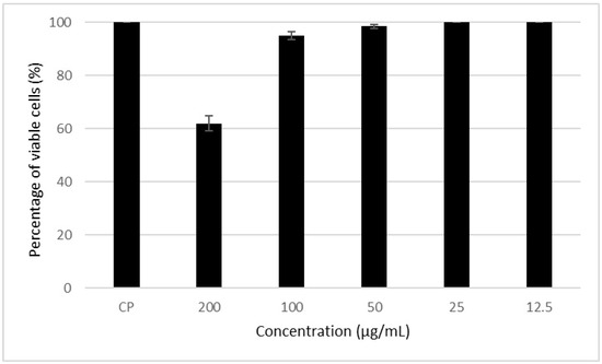 Figure 4 shows that the MS presented toxicity at the highest concentration (200 µg/mL) tested for this metabolite. It is also possible to note that in the other concentrations, cell viability was greater than 85%, which indicates low toxicity to mammalian cells. Concentrations that resulted in cell viability greater than 70% were considered non-toxic, as reported by Tunes [34].