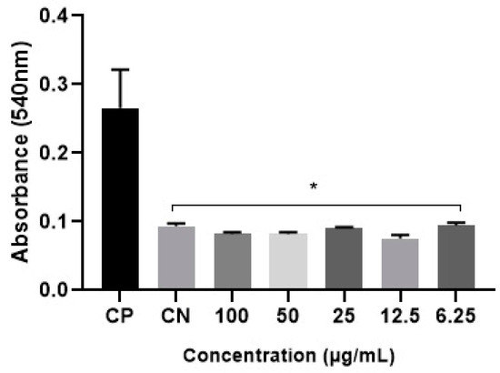 Evaluation of the SM hemolysis index. Columns marked with an asterisk (*) represent the statistically significant difference (* = p ≤ 0.01) in relation to the positive control group (PC) by the ANOVA test (p < 0.05) and post-Dunnett’s test.