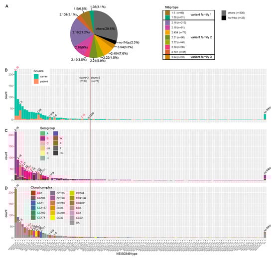 fHbp typing (A) and NEIS0349 typing (B–D) of 1013 Chinese N. meningitidis isolates. (A) This pie chart illustrates the top 10 fHbp variants based on isolate counts, which can be classified into three fHbp variant families. (B–D) These histograms illustrate NEIS0349 variants (n = 109) identified in Chinese isolates based on isolate counts. Among all of them, a total of 33 variants were identified in more than 3 isolates. These bar plots are colored by isolation source (B), serogroups (C) and clonal complexes (D). Each NEIS0349 variant was annotated with the corresponding fHbp variant on the respective bar, indicating the presence of similar characteristics among the majority of isolates in that bar (more than 60% isolates). The fHbp variants colored in red indicate that these particular variants can correspond to multiple NEIS0349 variants, each exhibiting distinct characteristics.