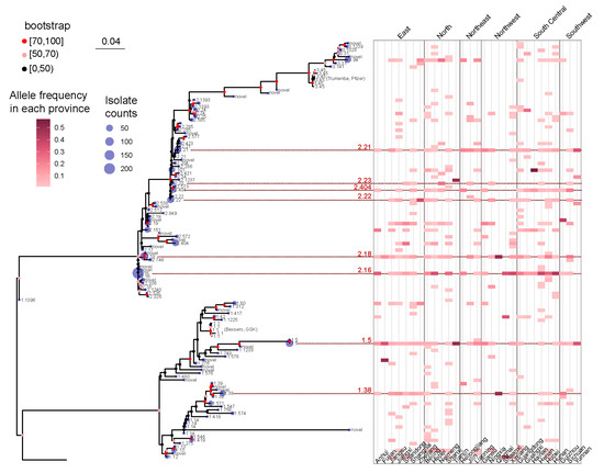 As exhibited in Figure 2, the maximum likelihood method was used to reconstruct the phylogenetic tree of Chinese strains’ fHbp alleles. The topological structure of the tree was verified 1000 times, and nodes with bootstrap values greater than 70% and 50% (marked in red and pink, respectively) are considered highly reliable. It is evident that the fHbp alleles of Chinese strains form two major evolutionary branches (named as clade 1 and clade 2, respectively). Clade 1 corresponds to fHbp variant family 1, while clade 2 corresponds to fHbp variant family 2 and 3 [9]. The reconstructed tree includes not only all the fHbp allele variants in Chinese strains but also the fHbp allele variants found in Bexsero (v1.1) and Trumenba (v3.45) vaccines, which are two protein-based serogroup B meningococcal vaccines that are currently available [11]. It is evident that the v1.1 and v3.45 variants are virtually absent in Chinese strains.