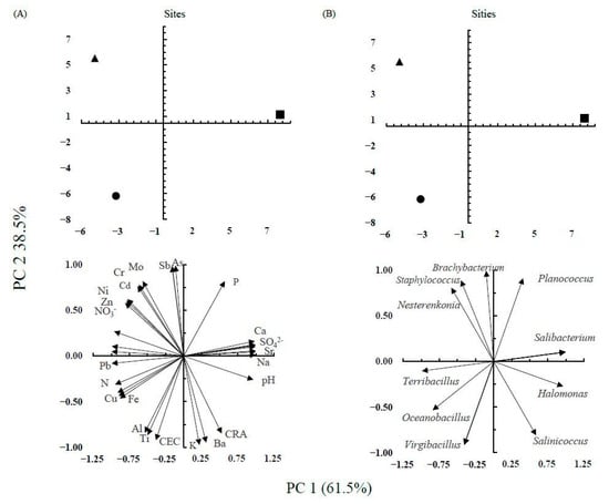 The “Los Negritos” soils showed some interesting characteristics; the cation exchange capacity (CEC) and total nitrogen (N) content of AS1 were 46.8 cmol kg−1 and 1.8 g kg−1 dry soil, respectively. The saline soil had a pH value of 9.2 and electrolytic conductivity (EC) of 17.6 dS m−1, while the AS2 soil showed a high content of arsenic (As; 175 mg kg−1 dry soil), cadmium (Cd; 5.7 mg kg−1 dry soil), and nitrates (NO3−; 39.7 mg kg−1 dry soil) [11]. Considering the above values, in this work the PCA analysis showed that the analyzed physicochemical characteristics of the “Los Negritos” soil explained 100% of the data variation and the association between these and the isolated strains (PC1 61.5% and PC2 38.5%; Figure 2). Members of Oceanobacillus, Terribacillus, and Virgibacillus were enriched in AS1, while members of Halomonas, Salibacterium, and Salimicrobium were enriched in the saline soil, and members of Brachybacterium, Nesterenkonia, and Staphylococcus were enriched in AS2 (Figure 2).