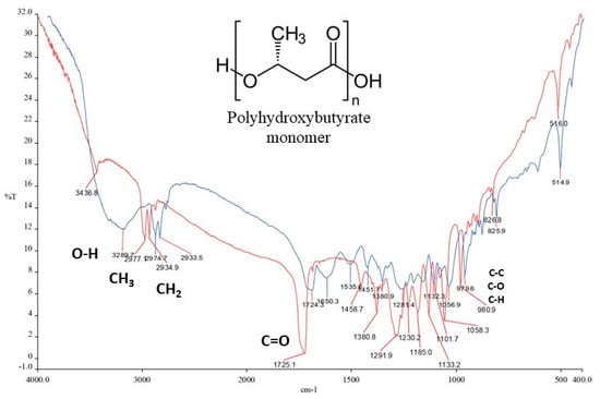 Fourier-transform infrared (FT-IR) spectra of polyhydroxybutyrate (PHB) extracted from Halomonas sp. LNSP3E3-1.2 (blue lines) and a pure PHB standard (red lines).