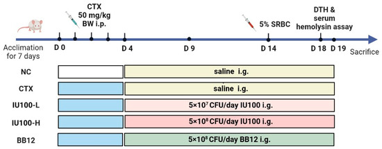Experimental protocol of this study. NC: normal control group; CTX: CTX-treated model group; IU100-L: low-dose IU100 group; IU100-H: high-dose IU100 group; BB12: positive control BB12 group. i.p., intraperitoneal injection. i.g., intragastric administration. BW, body weight.