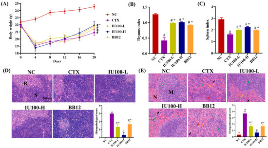 Effects of IU100 treatment on body weight, immune organ index and histopathology in CTX-treated mice. (A) Body weight. (B) Thymus index. (C) Spleen index. Histological examination and semi-quantitative scores of thymic (D) and splenic (E) sections (200× magnification). Data are expressed as the mean ± SEM, n = 12. # p < 0.05 vs. normal control group; * p < 0.05 vs. the CTX-induced model group. R: thymus medulla, S: thymus cortex, M: white pulp region of spleen, N: red pulp region of spleen. “↑” necrotic cell debris; “↑” red lineage cells; “↑” cranulocytes; “↑” megakaryocyte.