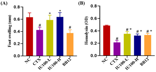 To understand the regulation effect of IU100 on cellular immune function, the DTH response was used to analyze the degree of tissue turgor. In Figure 3A, foot swelling was significantly reduced (p < 0.05) in the CTX group compared with the NC group. In contrast, both low and high doses of the IU100 treatment significantly improved (p < 0.05) foot edema, whereas BB12 administration had no effect on DTH reactions.