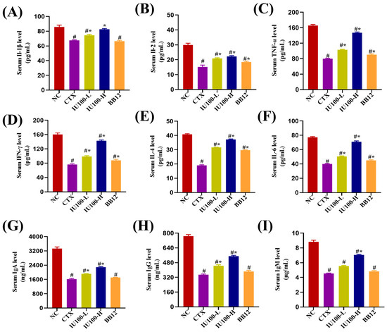 In Figure 4G–I, mice in the CTX group had significantly reduced (p < 0.05) serum IgA, IgG and IgM levels than those in the NC group. The levels of IgA, IgG and IgM in mice with IU100 administration increased (p < 0.05) compared with the CTX group. Meanwhile, immunoglobulins were higher in the IU100H group than in the IU100-L group. The BB12 administration had no effect on serum immunoglobulin levels. These results highlighted that IU100 can reduce the immunosuppressive effect of CTX in mice by enhancing humoral immunity.